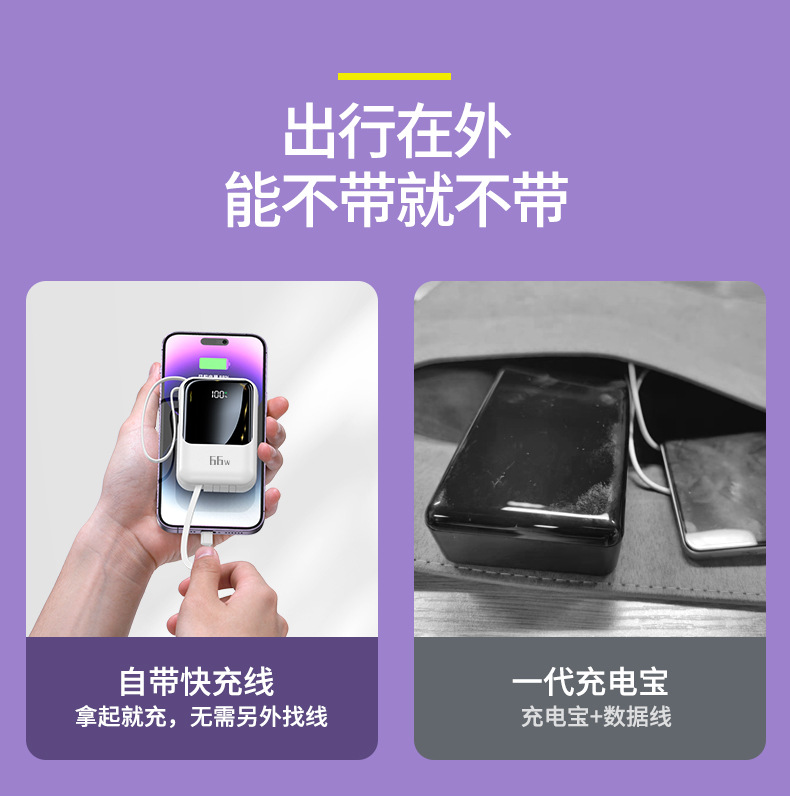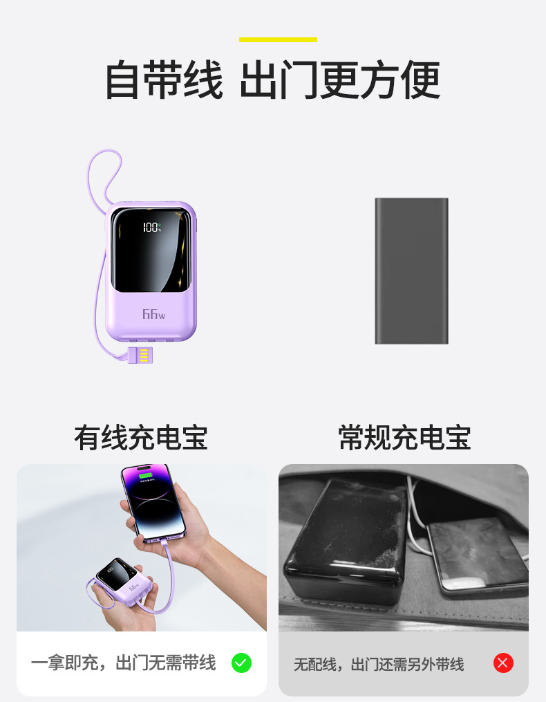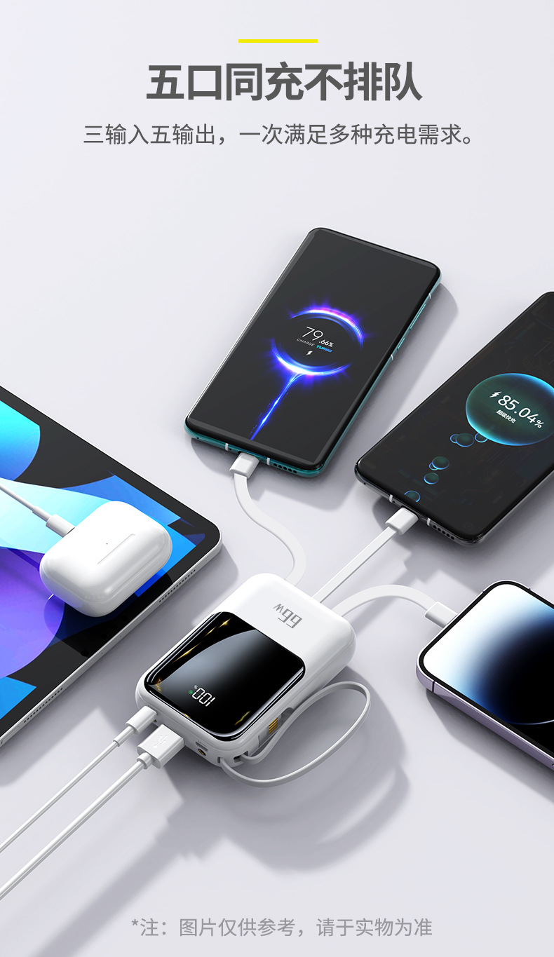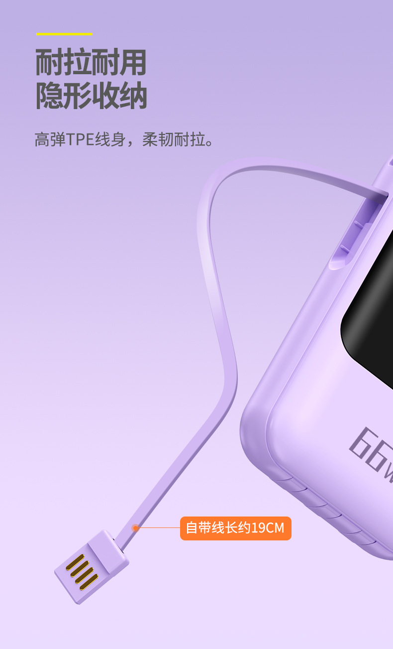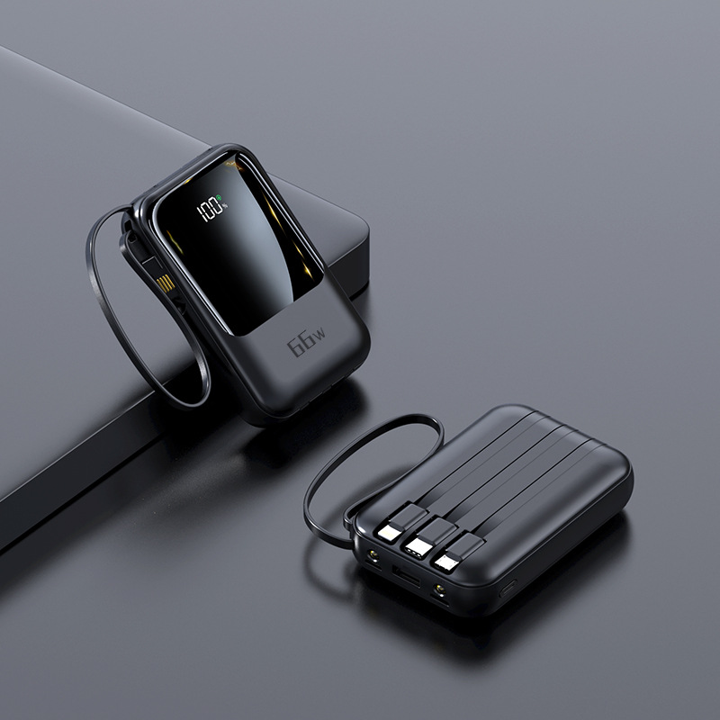 新款自带线超级快充充电宝20000毫安大容量礼品印制logo移动电源