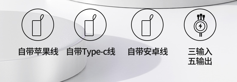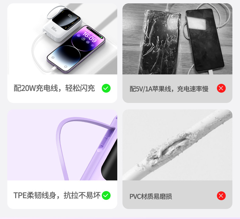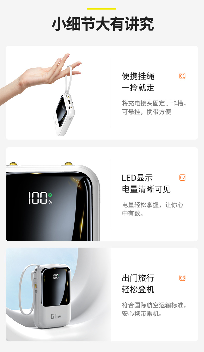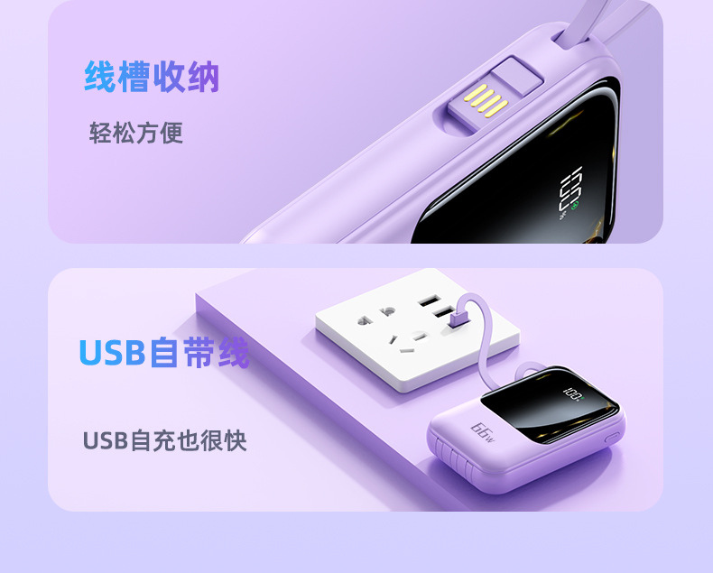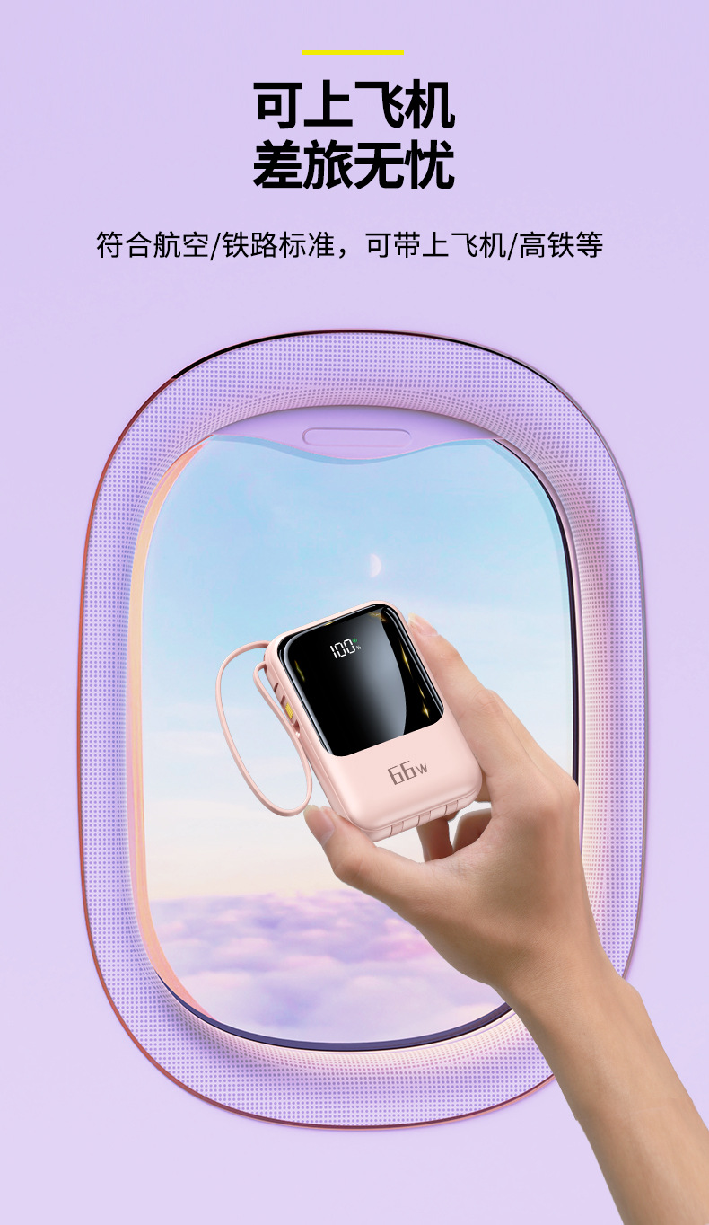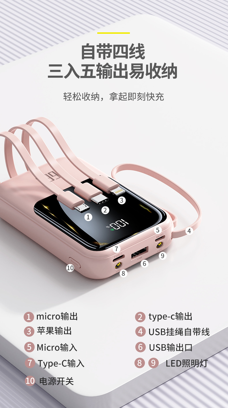 新款自带线超级快充充电宝20000毫安大容量礼品印制logo移动电源