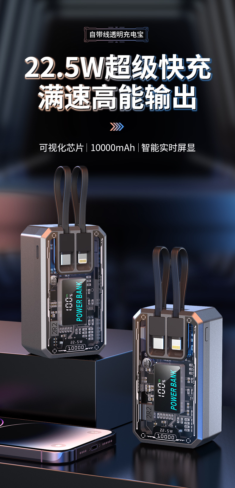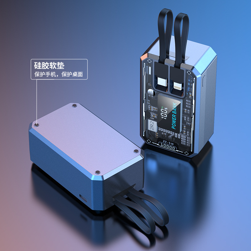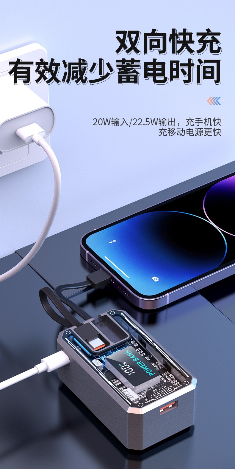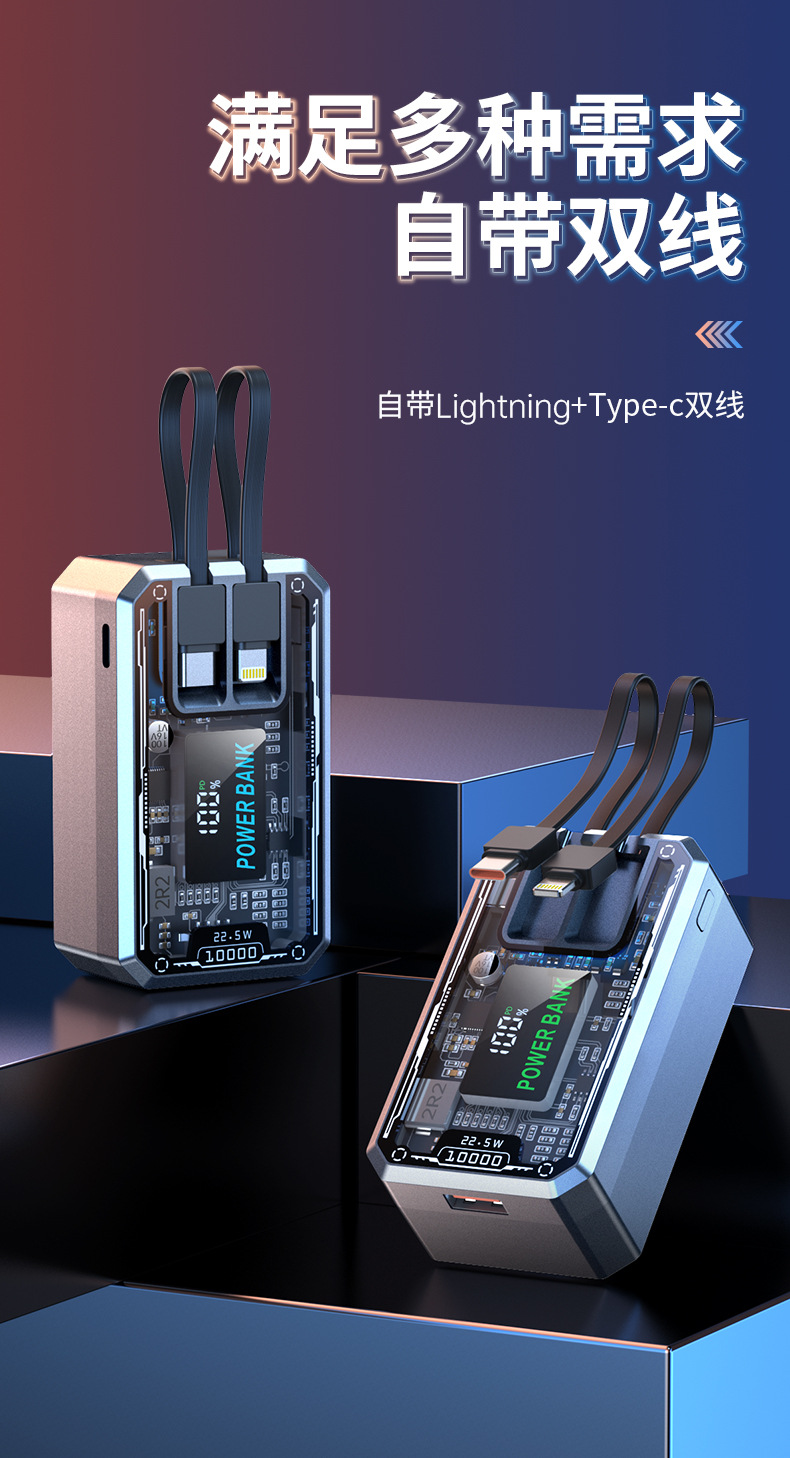透明机甲风自带线超级快充彩光充电宝10000mAh移动电源logo定 制