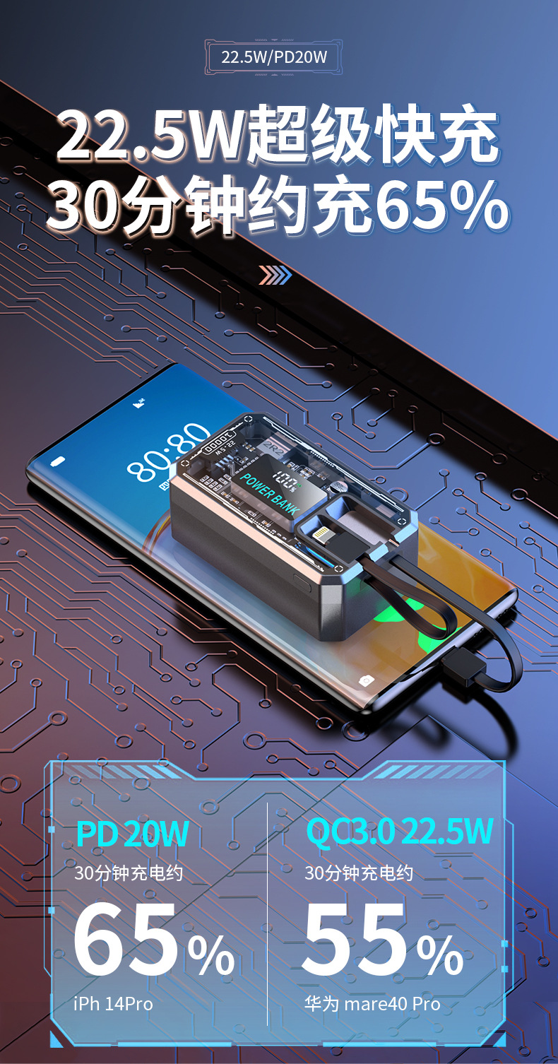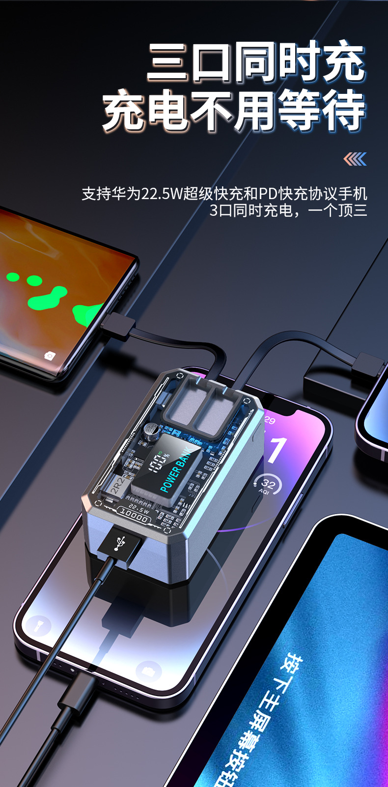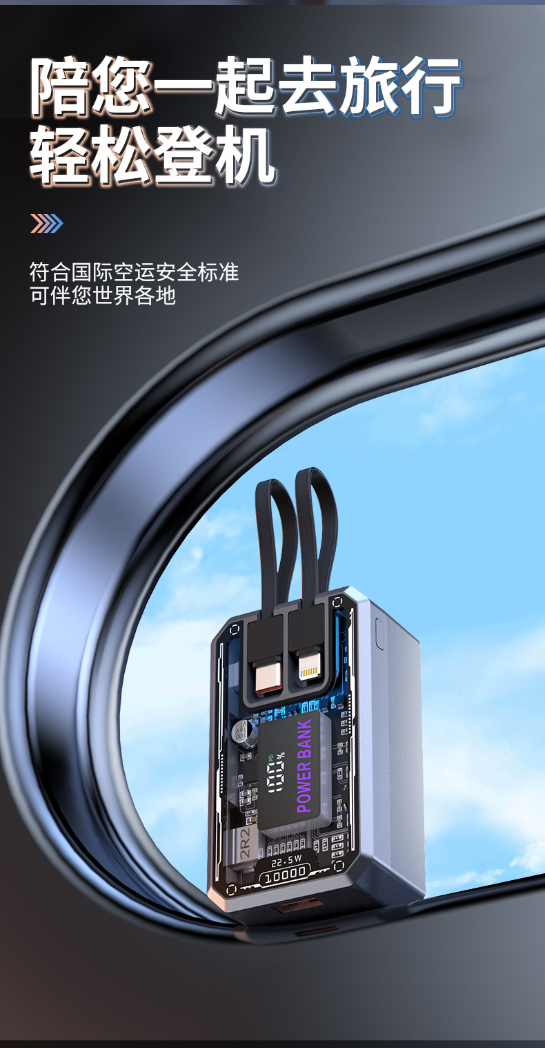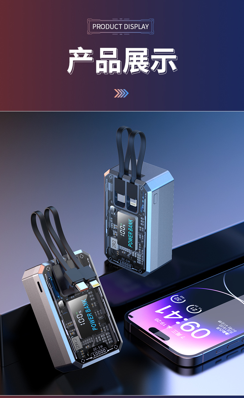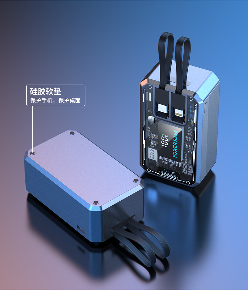 透明机甲风自带线超级快充彩光充电宝10000mAh移动电源logo定 制