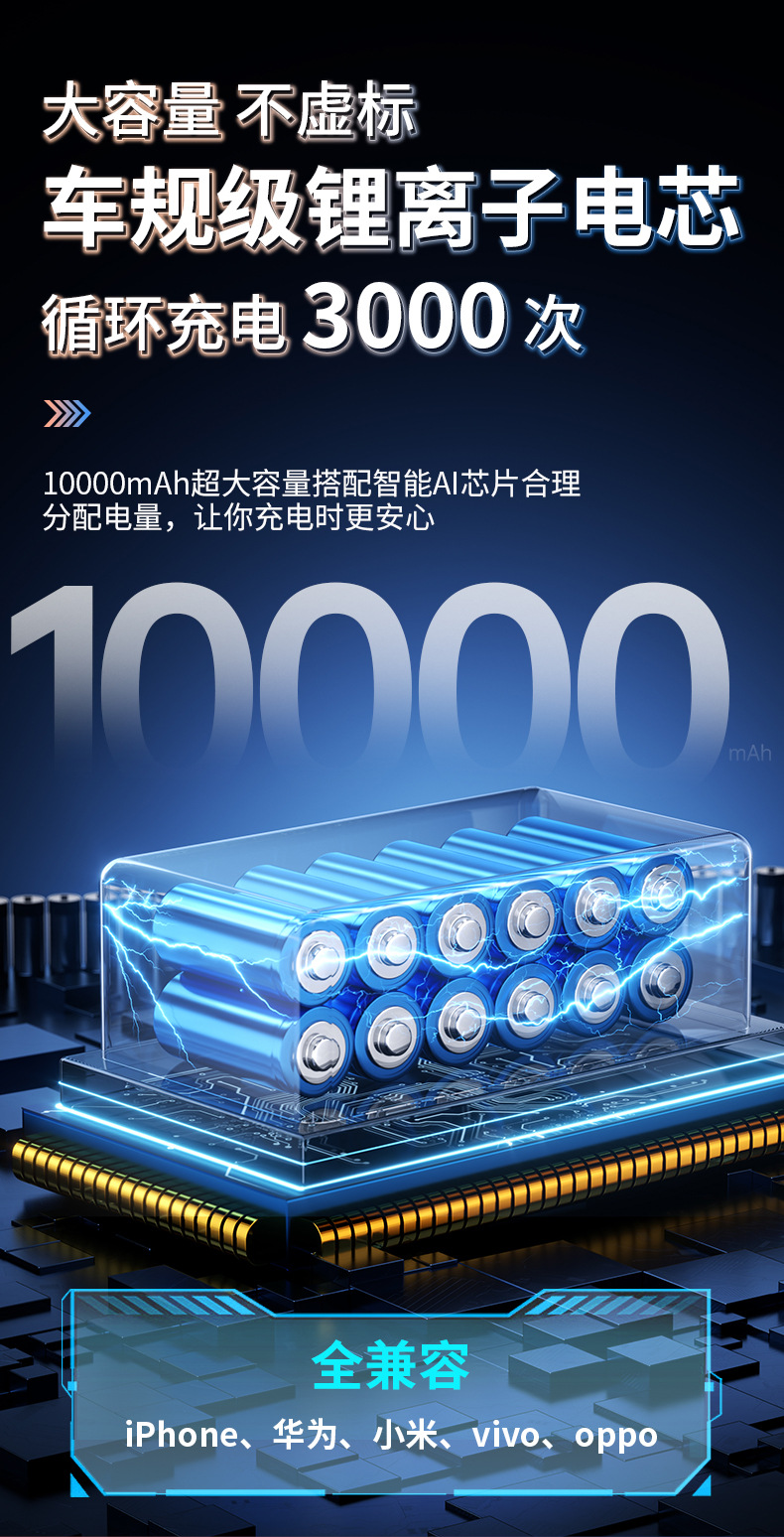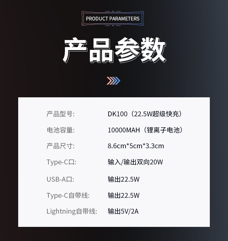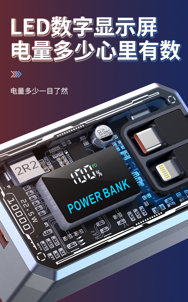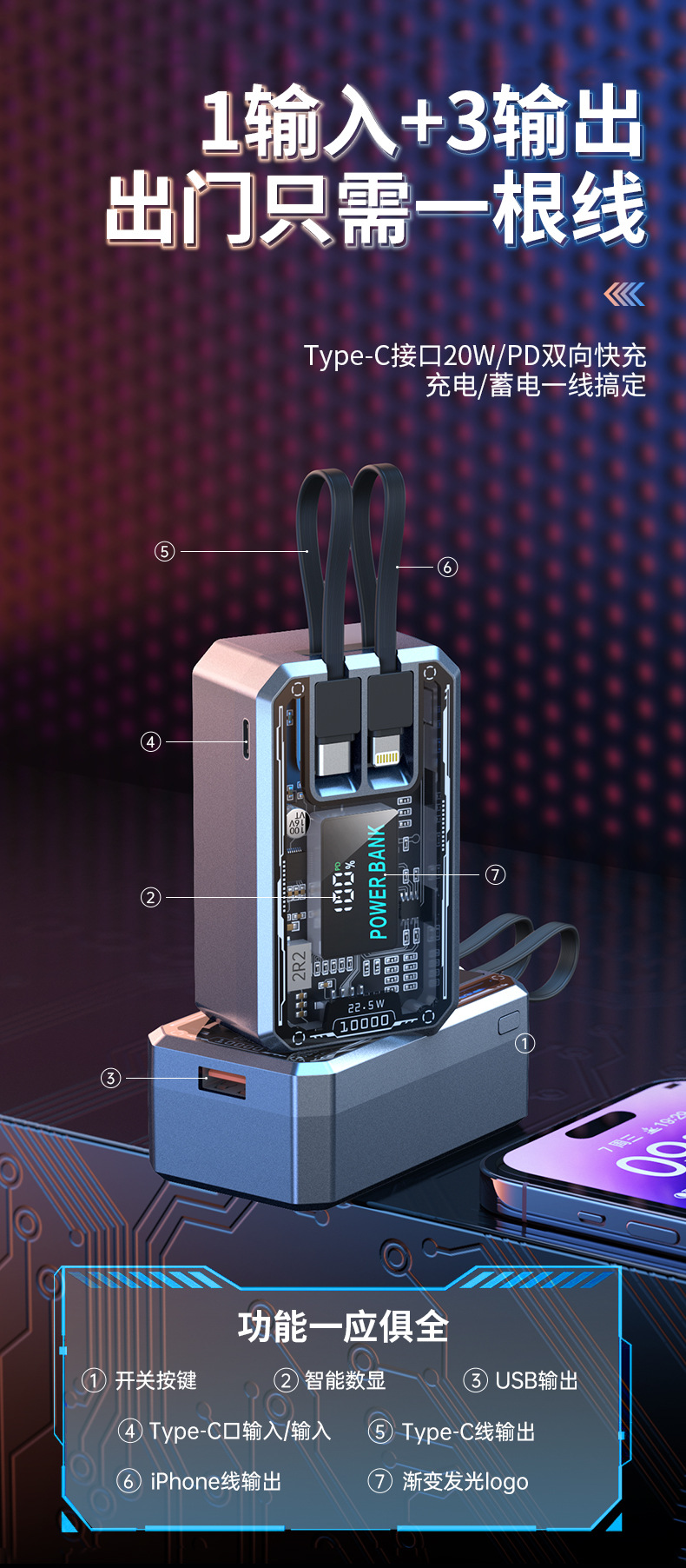 透明机甲风自带线超级快充彩光充电宝10000mAh移动电源logo定 制