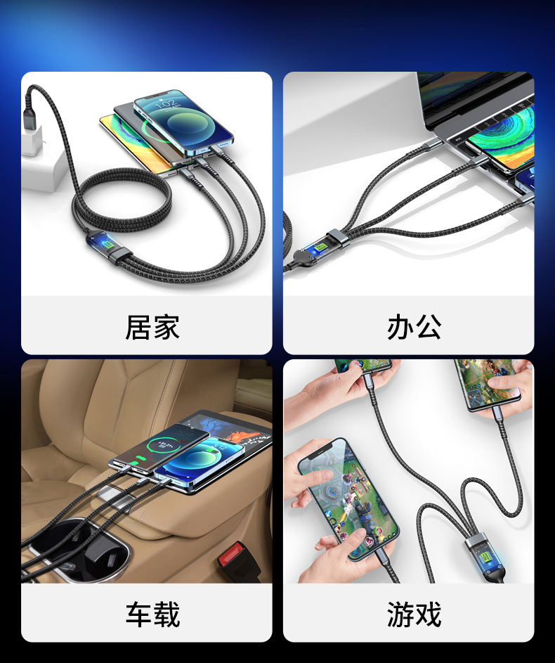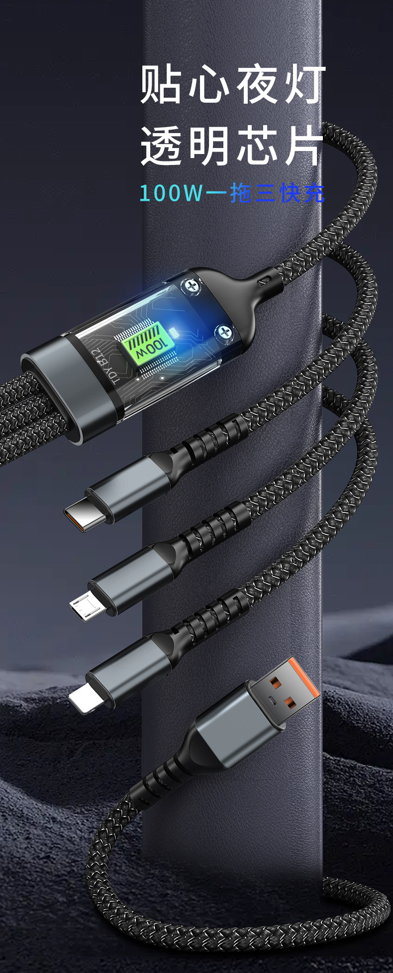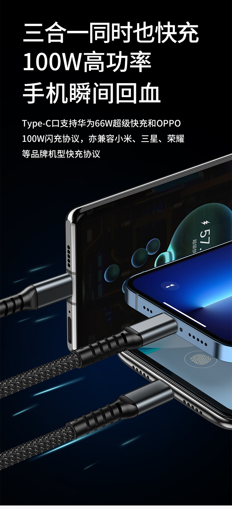 超级快充编织一拖三数据线礼品印制logo批发三合一闪充线6A充电线