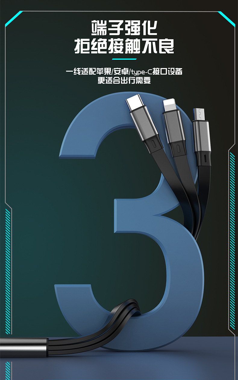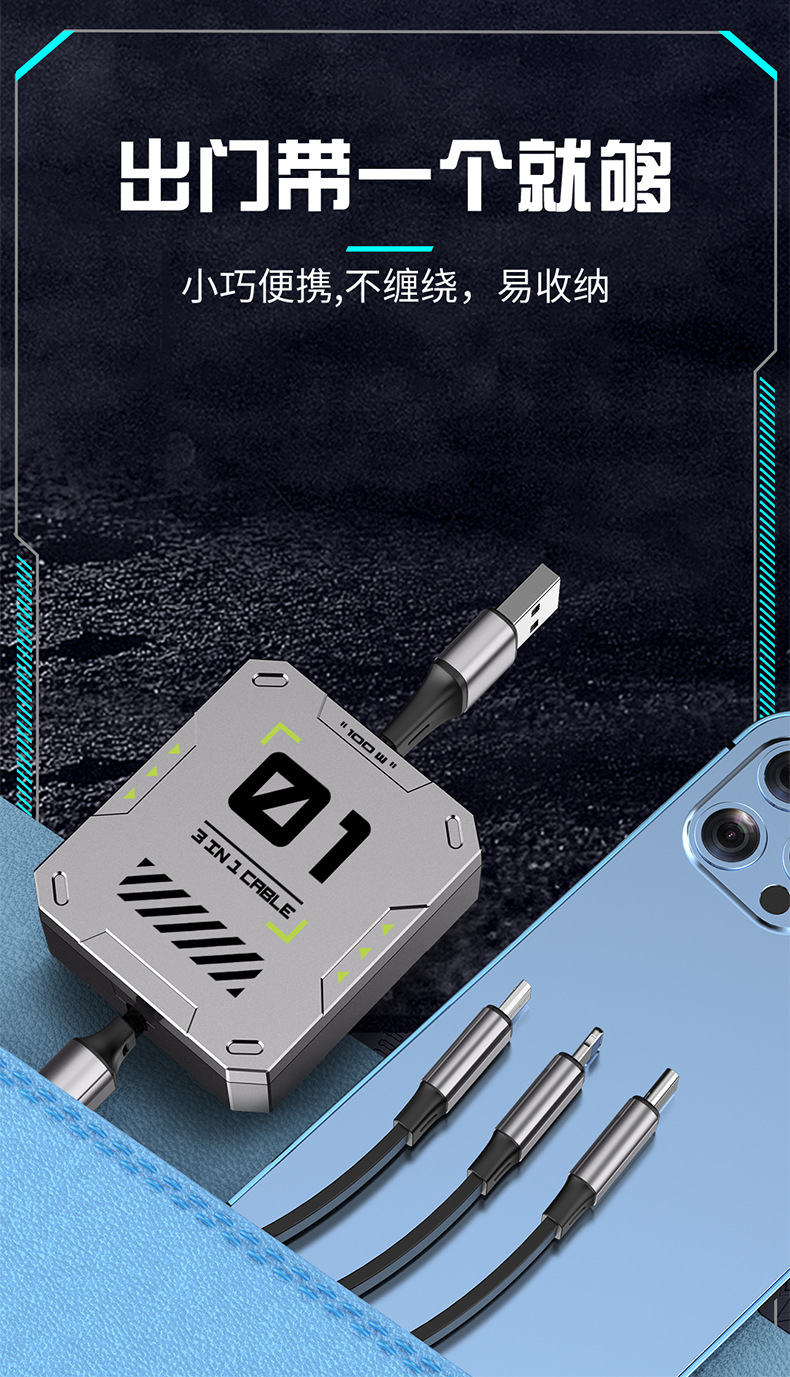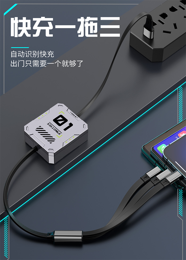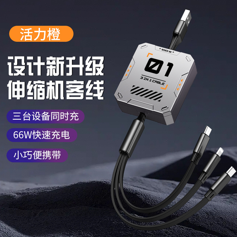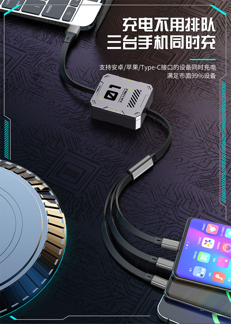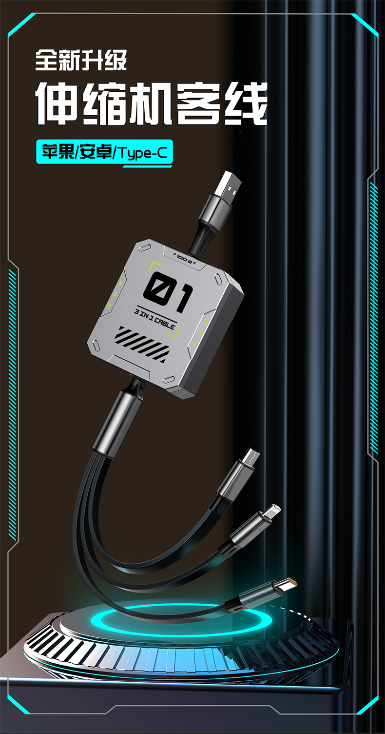 超级快充6A伸缩三合一数据线礼品印制图案一拖三快充机甲风充电线