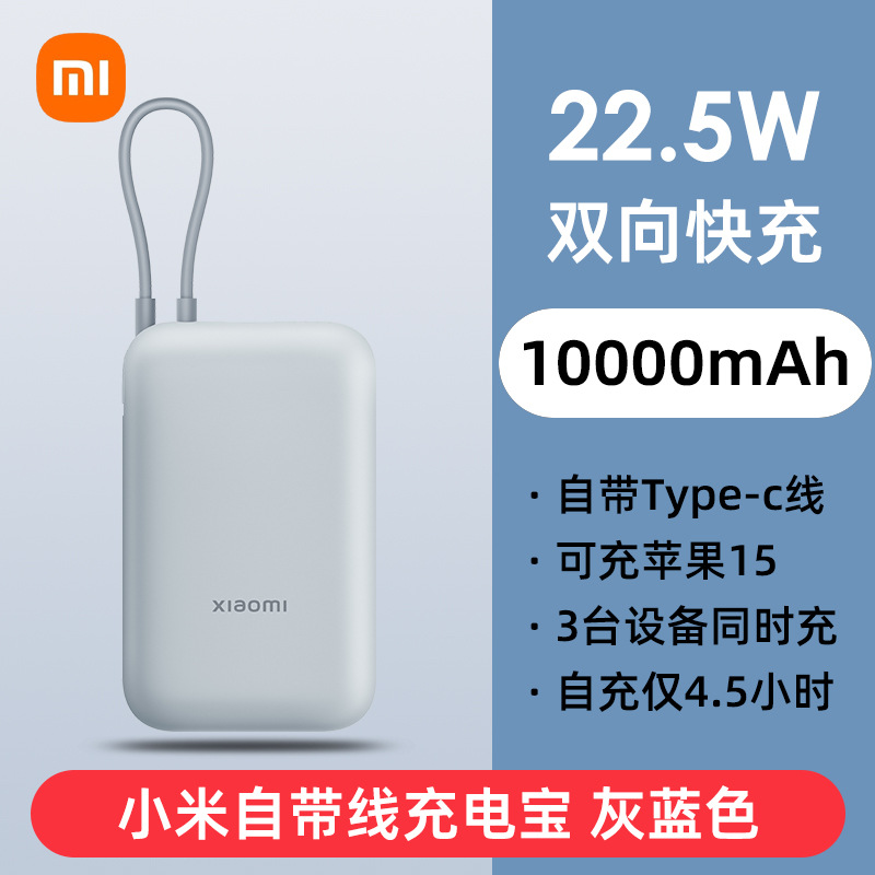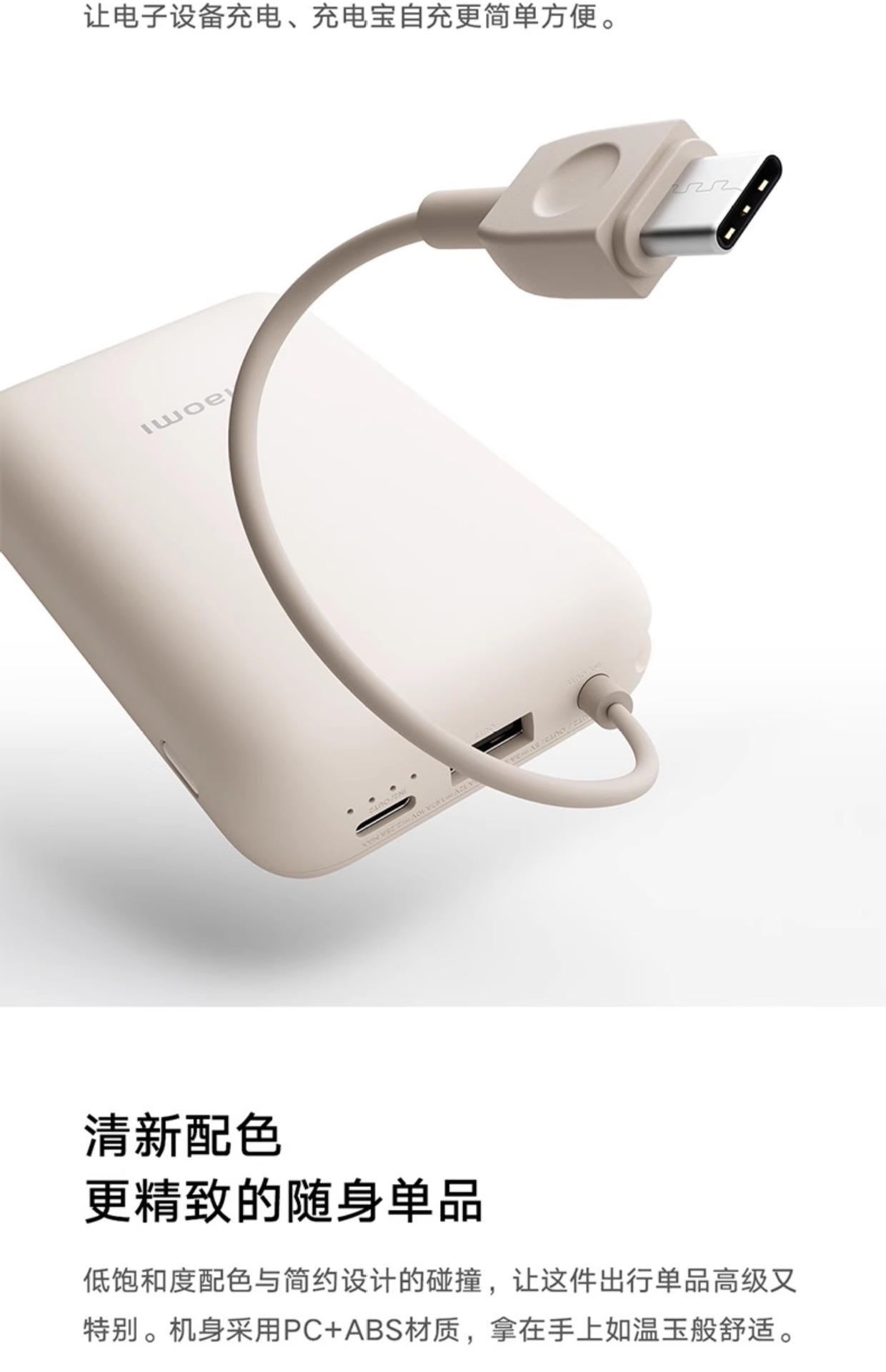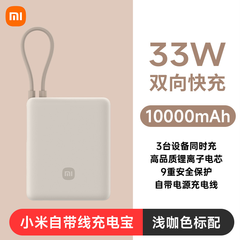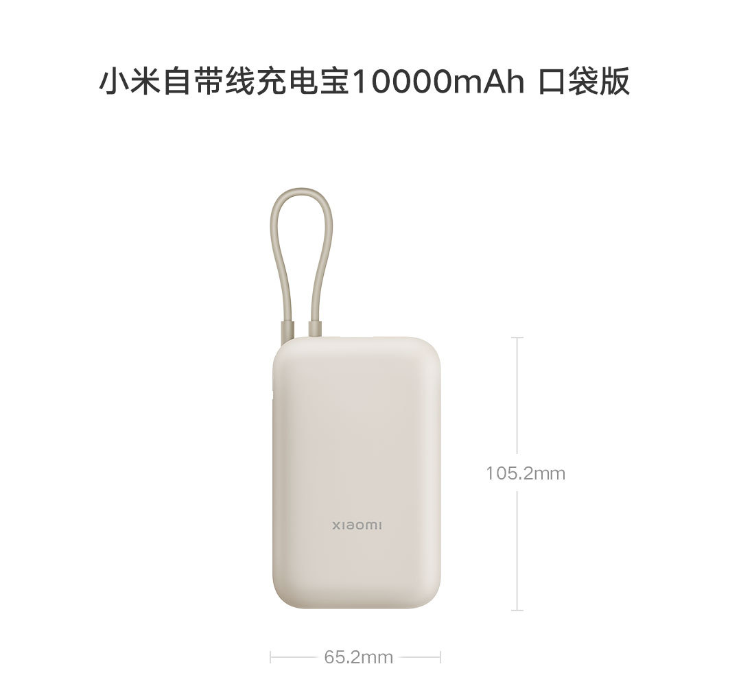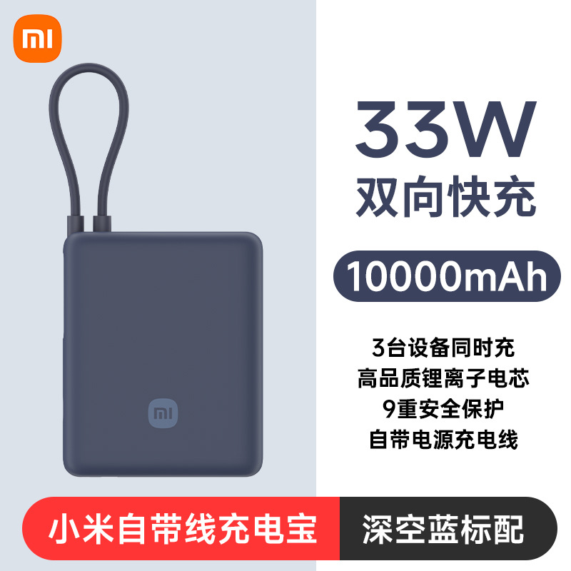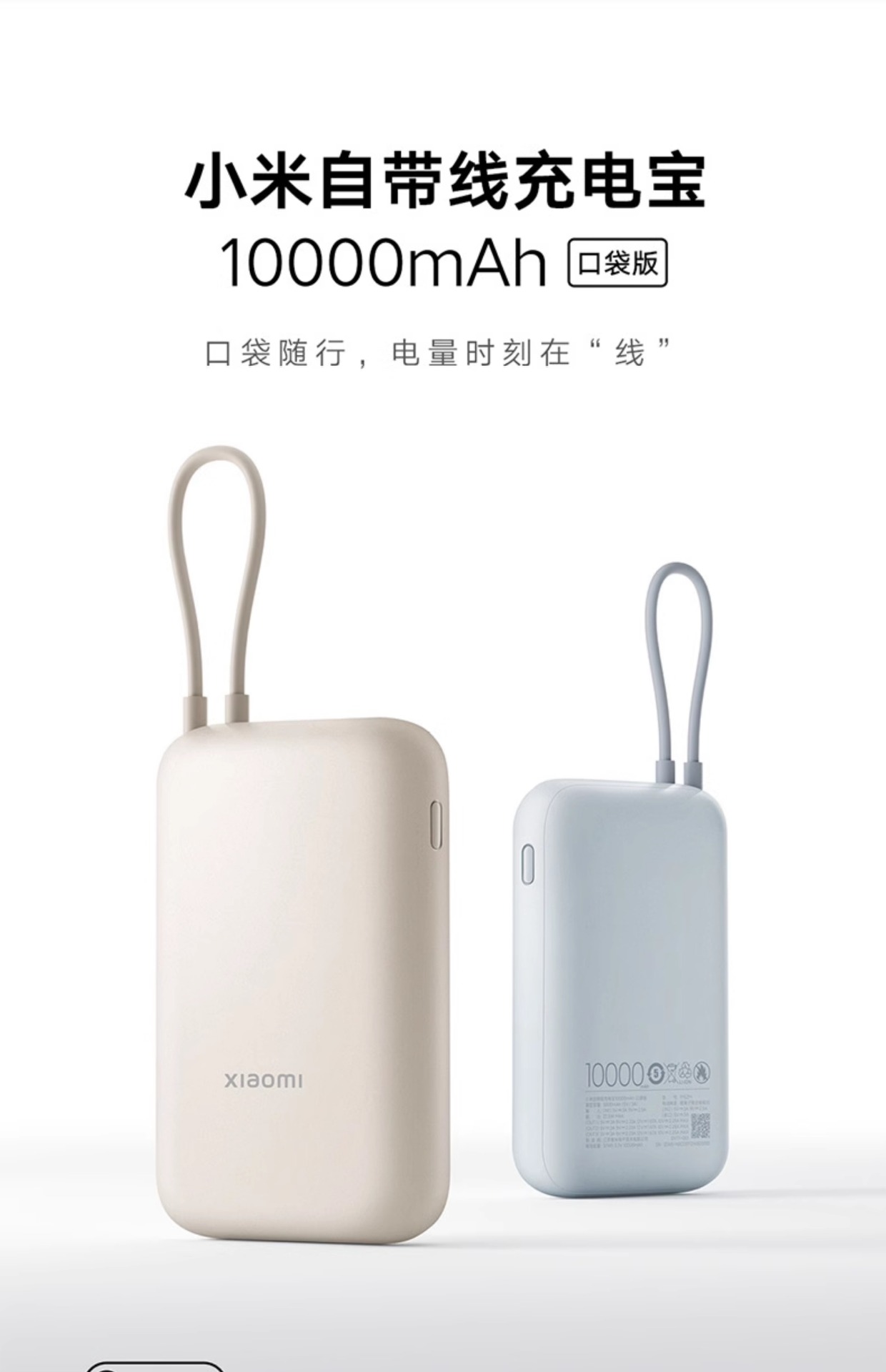 小米自带线充电宝10000mAh口袋版快充小巧迷你大容量便携移动电源