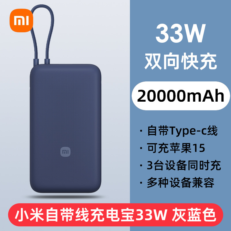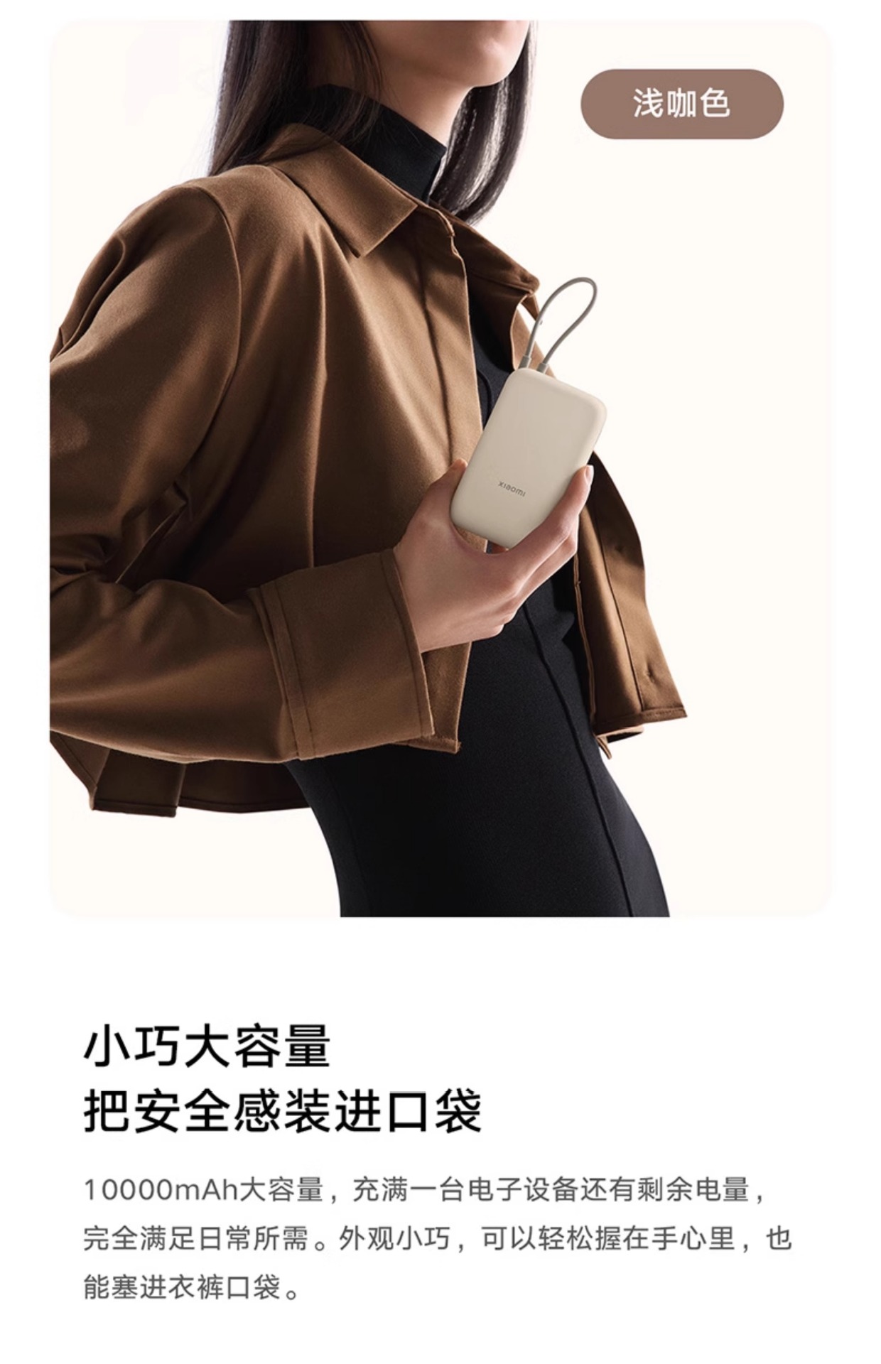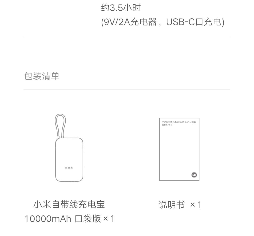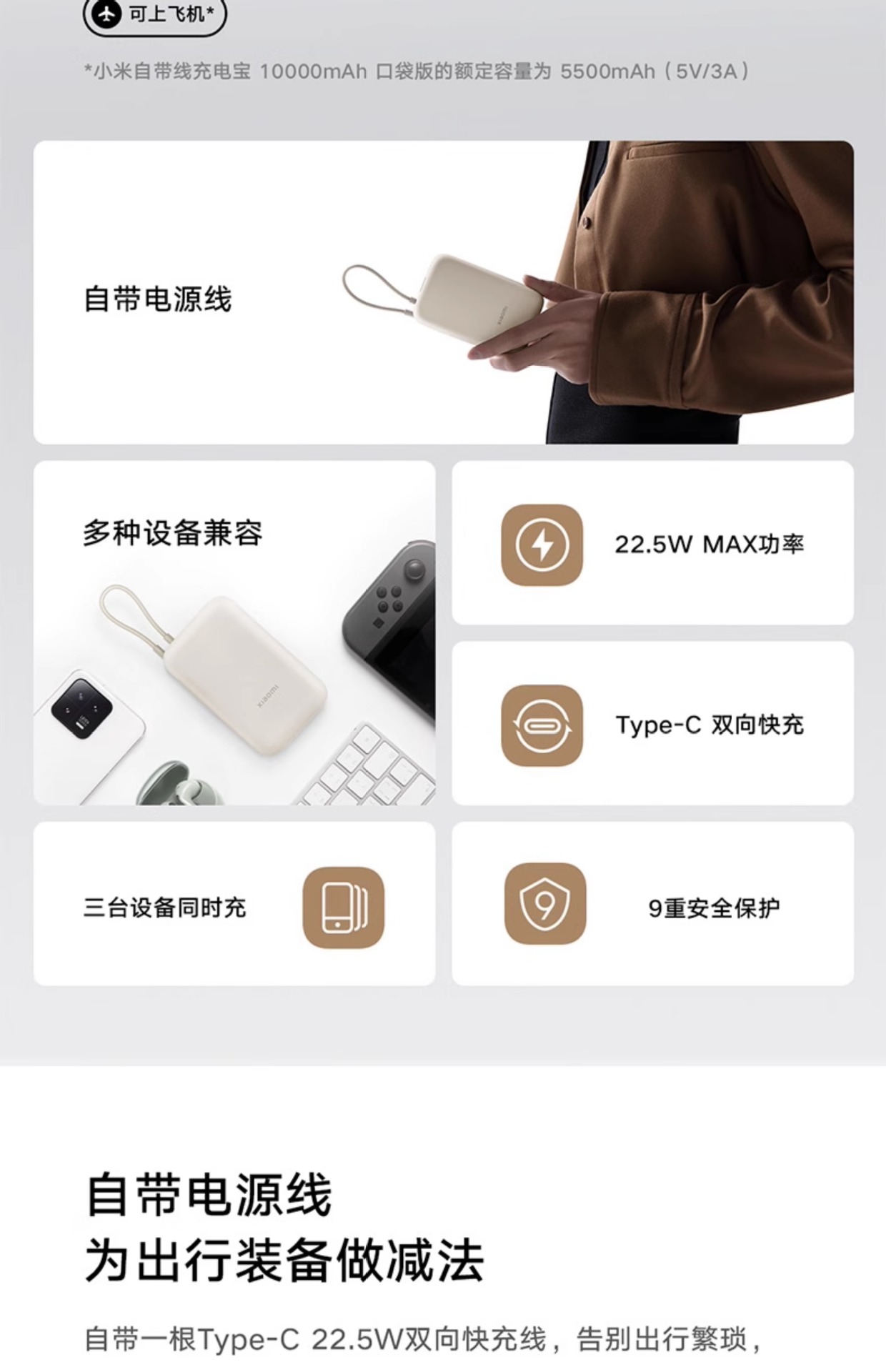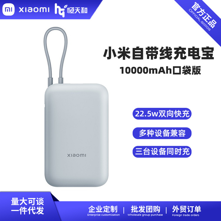 小米自带线充电宝10000mAh口袋版快充小巧迷你大容量便携移动电源