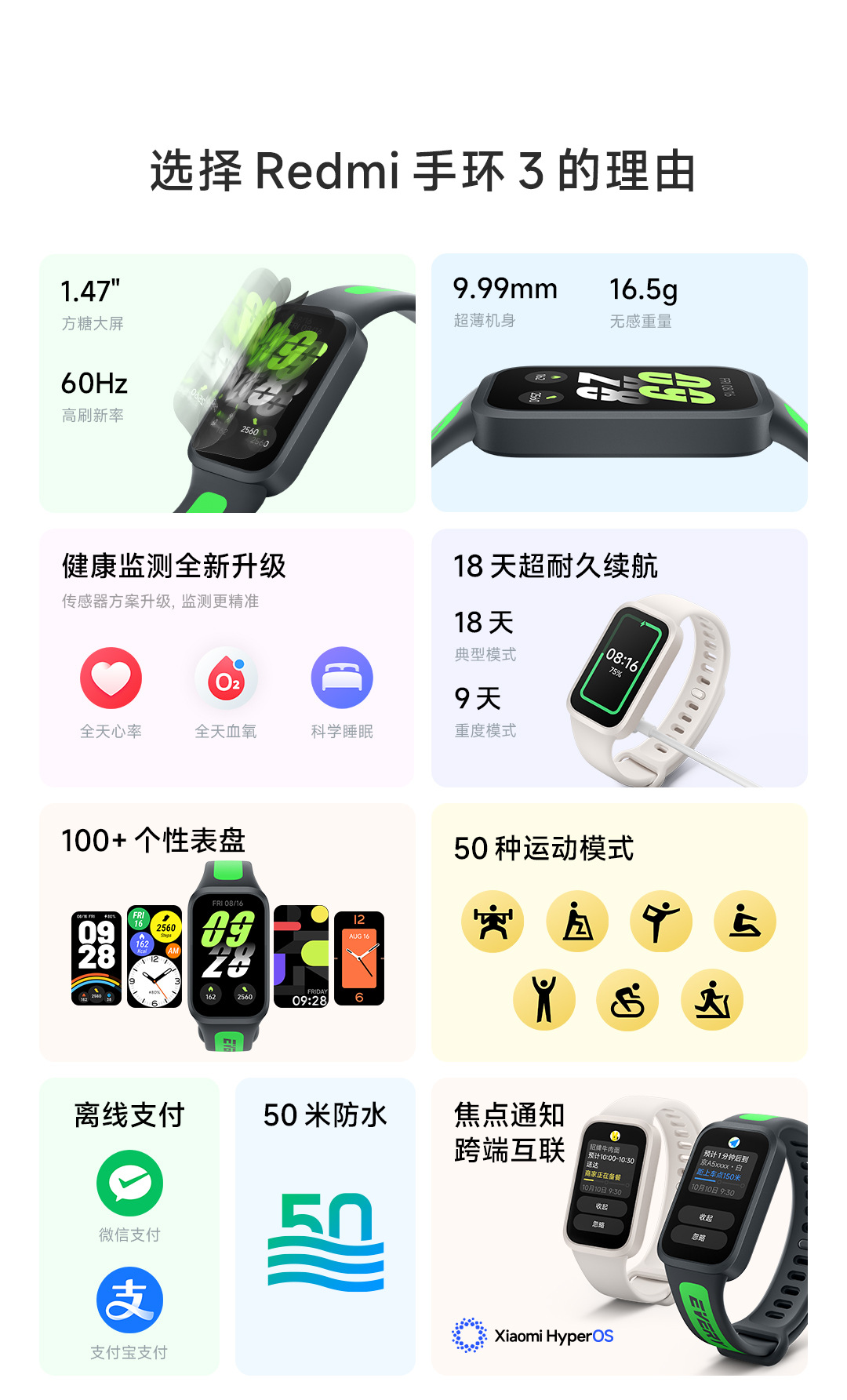 小米Redmi红米手环3运动智能防水手环血氧心率睡眠监测长续航